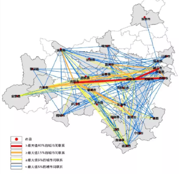 依据城市空间结构的模型,结合铁路客流量进行城市间联系的计算,南京和合肥的城市联系大于40%,和六安、滁州两地的联系大于15%,而在江苏省内,和南京达到这种联系的只有镇江一地而已。