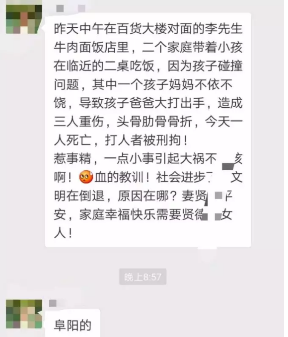 一则视频和留言在阜阳人的微信群里疯传!大致内容是这样的:说是有两家人在阜阳百货大楼对面的李先生牛肉面饭店吃饭,因为孩子碰撞问题,双方大打出手,三人受重伤,一人死亡,打人者还被刑拘了。不仅如此,还附有一