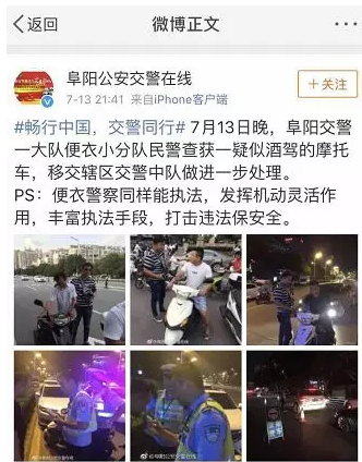 7月13日晚阜阳交警一大队便衣小分队民警查获一疑似酒驾的摩托车,移交辖区交警中队做进一步处理。便衣警察同样能执法,发挥机动灵活作用,丰富执法手段,打击违法保安全。拒绝酒驾!100毫升血液中酒精含量达到